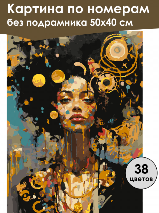Картина по номерам без подрамника, размер 50х40 см, произведена нами. Она включает 40 оттенков и 2772 контуров, что придаёт ей глубину цвета и плавные переходы. Картина выглядит более ярко и живо. В комплект входит глянцевый лак, которым можно покрыть работу по желанию. Краски имеют хорошую укрывистость, хватает двух проходов что бы закрасить символы на схеме. Так же они сохраняют текстуру мазков, не растекаясь и не разглаживаясь полностью на холсте. При покрытии глянцевым лаком создаётся эффект приближенный к масляной живописи. Краски упакованы герметично, что сохраняет их жидкими. Все необходимые инструменты для начала работы также входят в комплект. Мы не используем экосольвентные чернила, которые содержат свинец и могут быть вредны для здоровья. Наши картины напечатаны безопасными водными пигментными чернилами, обеспечивающими чёткое изображение и легко читаемые обозначения. Холст плотный, имеет мелкую зернистость, легко разглаживается и устойчив к сминанию. Картина поставляется в бурой коробке. Следует отметить, что картина без подрамника её нельзя натянуть на подрамник из-за узких краёв, она предназначена для оформления в рамочку. Портрет девушки в стиле афрофутуризма с выразительным лицом и пышной чёрной причёской, украшенной золотыми кругами и орнаментами, создающими иллюзию космических объектов на фоне насыщенных тёплых оттенков.