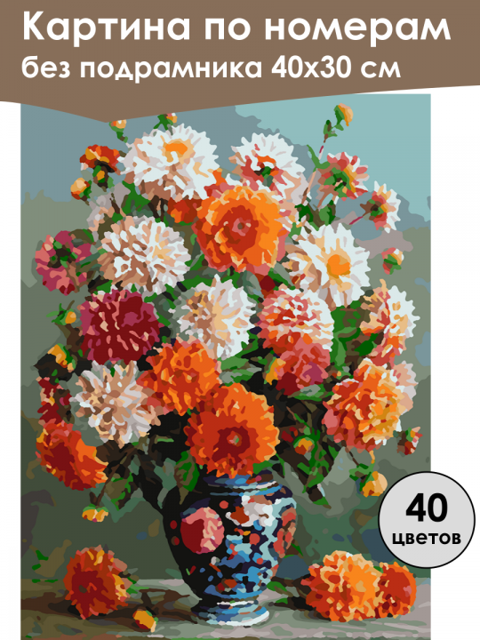 Картина по номерам без подрамника, размер 40х30 см, произведена нами. Она включает 40 оттенков и 2407 контуров, что придаёт ей глубину цвета и плавные переходы. Картина выглядит более ярко и живо. В комплект входит глянцевый лак, которым можно покрыть работу по желанию. Краски имеют хорошую укрывистость, хватает двух проходов что бы закрасить символы на схеме. Так же они сохраняют текстуру мазков, не растекаясь и не разглаживаясь полностью на холсте. При покрытии глянцевым лаком создаётся эффект приближенный к масляной живописи. Краски упакованы герметично, что сохраняет их жидкими. Все необходимые инструменты для начала работы также входят в комплект. Мы не используем экосольвентные чернила, которые содержат свинец и могут быть вредны для здоровья. Наши картины напечатаны безопасными водными пигментными чернилами, обеспечивающими чёткое изображение и легко читаемые обозначения. Холст плотный, имеет мелкую зернистость, легко разглаживается и устойчив к сминанию. Картина поставляется в бурой коробке. Следует отметить, что картина без подрамника её нельзя натянуть на подрамник из-за узких краёв, она предназначена для оформления в рамочку. Цветочный натюрморт, изображающий вазу с яркими георгинами разных оттенков оранжевого, белого и розового цветов на фоне сине-зелёного тона; ваза украшена разноцветными узорами, а несколько цветков лежат отдельно на поверхности.