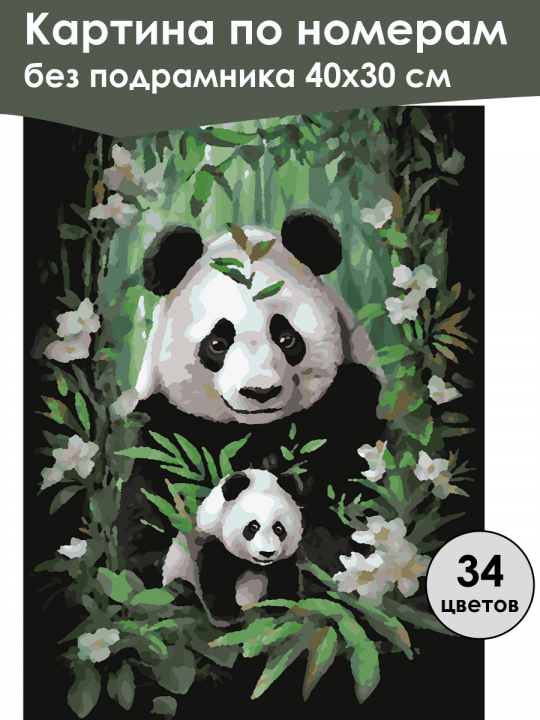 Картина по номерам без подрамника, размер 40х30 см, произведена нами. Она включает 40 оттенков и 2122 контуров, что придаёт ей глубину цвета и плавные переходы. Картина выглядит более ярко и живо. В комплект входит глянцевый лак, которым можно покрыть работу по желанию. Краски имеют хорошую укрывистость, хватает двух проходов что бы закрасить символы на схеме. Так же они сохраняют текстуру мазков, не растекаясь и не разглаживаясь полностью на холсте. При покрытии глянцевым лаком создаётся эффект приближенный к масляной живописи. Краски упакованы герметично, что сохраняет их жидкими. Все необходимые инструменты для начала работы также входят в комплект. Мы не используем экосольвентные чернила, которые содержат свинец и могут быть вредны для здоровья. Наши картины напечатаны безопасными водными пигментными чернилами, обеспечивающими чёткое изображение и легко читаемые обозначения. Холст плотный, имеет мелкую зернистость, легко разглаживается и устойчив к сминанию. Картина поставляется в бурой коробке. Следует отметить, что картина без подрамника её нельзя натянуть на подрамник из-за узких краёв, она предназначена для оформления в рамочку. Две панды, взрослая и детёныш, уютно устроились среди густой зелени и белых цветов джунглей, создавая умиротворённую атмосферу дикой природы.