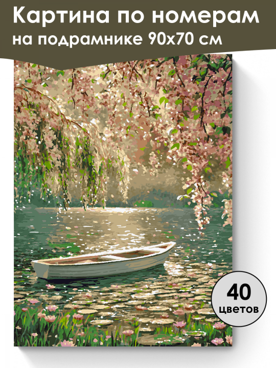 Картина по номерам на подрамнике, размер 90х70 см, произведена нами. Она включает 40 оттенков и 9534 контуров, что придаёт ей глубину цвета и плавные переходы. Картина выглядит более ярко и живо. В комплект входит глянцевый лак, которым можно покрыть работу по желанию. Краски имеют хорошую укрывистость, хватает двух проходов что бы закрасить символы на схеме. Так же они сохраняют текстуру мазков, не растекаясь и не разглаживаясь полностью на холсте. При покрытии глянцевым лаком создаётся эффект приближенный к масляной живописи. Краски упакованы герметично, что сохраняет их жидкими. Все необходимые инструменты для начала работы также включены в комплект, в том числе и крепления на стену. В картине используется крепкий подрамник со специальной вставкой, которая предотвращает провисание холста во время рисования. Это обеспечивает комфортный процесс работы и гарантирует, что холст всегда будет оставаться хорошо натянутым. Мы не используем экосольвентные чернила, которые содержат свинец и могут быть вредны для здоровья. Наши картины напечатаны безопасными водными пигментными чернилами, обеспечивающими чёткое изображение и легко читаемые обозначения. Холст плотный, имеет мелкую зернистость, легко разглаживается и устойчив к сминанию. Картина поставляется в защищённой бурой коробке. Живописная сцена с лодкой на спокойной воде, окруженной цветами и зелёной растительностью; в небе игра светотеней, будто сияет солнце, создавая атмосферу умиротворения и красоты весеннего парка.
