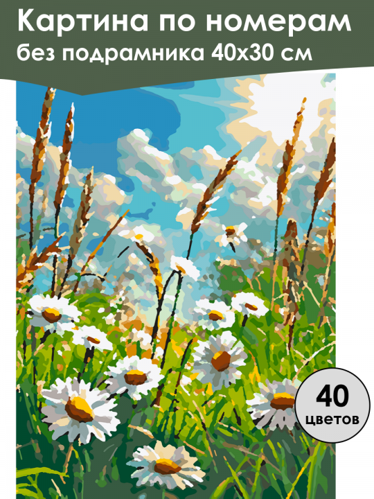Картина по номерам без подрамника, размер 40х30 см, произведена нами. Она включает 40 оттенков и 2612 контуров, что придаёт ей глубину цвета и плавные переходы. Картина выглядит более ярко и живо. В комплект входит глянцевый лак, которым можно покрыть работу по желанию. Краски имеют хорошую укрывистость, хватает двух проходов что бы закрасить символы на схеме. Так же они сохраняют текстуру мазков, не растекаясь и не разглаживаясь полностью на холсте. При покрытии глянцевым лаком создаётся эффект приближенный к масляной живописи. Краски упакованы герметично, что сохраняет их жидкими. Все необходимые инструменты для начала работы также входят в комплект. Мы не используем экосольвентные чернила, которые содержат свинец и могут быть вредны для здоровья. Наши картины напечатаны безопасными водными пигментными чернилами, обеспечивающими чёткое изображение и легко читаемые обозначения. Холст плотный, имеет мелкую зернистость, легко разглаживается и устойчив к сминанию. Картина поставляется в бурой коробке. Следует отметить, что картина без подрамника её нельзя натянуть на подрамник из-за узких краёв, она предназначена для оформления в рамочку. Поле с ромашками и колосьями под ярким солнцем на фоне голубого неба и пушистых облаков, создающее яркую и жизнерадостную атмосферу природы в летний день.