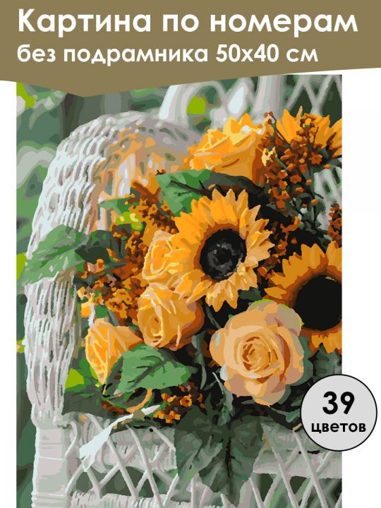 Картина по номерам без подрамника, размер 50х40 см, произведена нами. Она включает 40 оттенков и 3104 контуров, что придаёт ей глубину цвета и плавные переходы. Картина выглядит более ярко и живо. В комплект входит глянцевый лак, которым можно покрыть работу по желанию. Краски имеют хорошую укрывистость, хватает двух проходов что бы закрасить символы на схеме. Так же они сохраняют текстуру мазков, не растекаясь и не разглаживаясь полностью на холсте. При покрытии глянцевым лаком создаётся эффект приближенный к масляной живописи. Краски упакованы герметично, что сохраняет их жидкими. Все необходимые инструменты для начала работы также входят в комплект. Мы не используем экосольвентные чернила, которые содержат свинец и могут быть вредны для здоровья. Наши картины напечатаны безопасными водными пигментными чернилами, обеспечивающими чёткое изображение и легко читаемые обозначения. Холст плотный, имеет мелкую зернистость, легко разглаживается и устойчив к сминанию. Картина поставляется в бурой коробке. Следует отметить, что картина без подрамника её нельзя натянуть на подрамник из-за узких краёв, она предназначена для оформления в рамочку. Букет подсолнухов и розовых цветов с зелёными листьями, расположен на плетёном белом кресле, на фоне зелёной растительности.