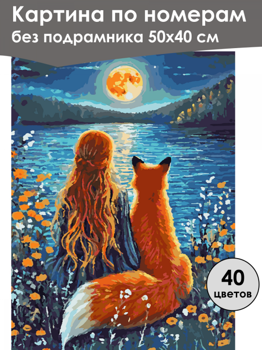 Картина по номерам без подрамника, размер 50х40 см, произведена нами. Она включает 40 оттенков и 3375 контуров, что придаёт ей глубину цвета и плавные переходы. Картина выглядит более ярко и живо. В комплект входит глянцевый лак, которым можно покрыть работу по желанию. Краски имеют хорошую укрывистость, хватает двух проходов что бы закрасить символы на схеме. Так же они сохраняют текстуру мазков, не растекаясь и не разглаживаясь полностью на холсте. При покрытии глянцевым лаком создаётся эффект приближенный к масляной живописи. Краски упакованы герметично, что сохраняет их жидкими. Все необходимые инструменты для начала работы также входят в комплект. Мы не используем экосольвентные чернила, которые содержат свинец и могут быть вредны для здоровья. Наши картины напечатаны безопасными водными пигментными чернилами, обеспечивающими чёткое изображение и легко читаемые обозначения. Холст плотный, имеет мелкую зернистость, легко разглаживается и устойчив к сминанию. Картина поставляется в бурой коробке. Следует отметить, что картина без подрамника её нельзя натянуть на подрамник из-за узких краёв, она предназначена для оформления в рамочку. Девушка с длинными рыжими волосами и сидящая рядом лиса смотрят на озеро, отражающее полную луну; вокруг цветут оранжевые и белые цветы на фоне гор и тёмного неба.