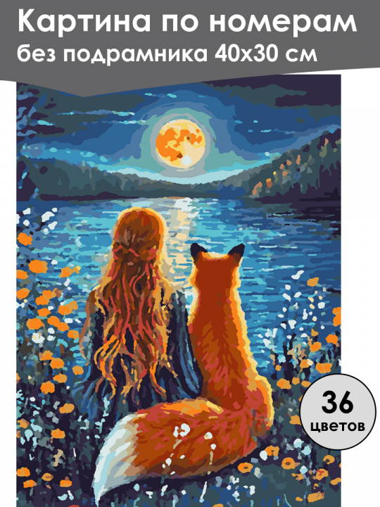 Картина по номерам без подрамника, размер 40х30 см, произведена нами. Она включает 40 оттенков и 2423 контуров, что придаёт ей глубину цвета и плавные переходы. Картина выглядит более ярко и живо. В комплект входит глянцевый лак, которым можно покрыть работу по желанию. Краски имеют хорошую укрывистость, хватает двух проходов что бы закрасить символы на схеме. Так же они сохраняют текстуру мазков, не растекаясь и не разглаживаясь полностью на холсте. При покрытии глянцевым лаком создаётся эффект приближенный к масляной живописи. Краски упакованы герметично, что сохраняет их жидкими. Все необходимые инструменты для начала работы также входят в комплект. Мы не используем экосольвентные чернила, которые содержат свинец и могут быть вредны для здоровья. Наши картины напечатаны безопасными водными пигментными чернилами, обеспечивающими чёткое изображение и легко читаемые обозначения. Холст плотный, имеет мелкую зернистость, легко разглаживается и устойчив к сминанию. Картина поставляется в бурой коробке. Следует отметить, что картина без подрамника её нельзя натянуть на подрамник из-за узких краёв, она предназначена для оформления в рамочку. Девушка с длинными рыжими волосами и сидящая рядом лиса смотрят на озеро, отражающее полную луну; вокруг цветут оранжевые и белые цветы на фоне гор и тёмного неба.
