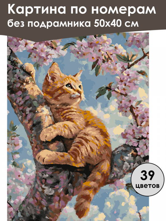 Картина по номерам без подрамника, размер 50х40 см, произведена нами. Она включает 40 оттенков и 3934 контуров, что придаёт ей глубину цвета и плавные переходы. Картина выглядит более ярко и живо. В комплект входит глянцевый лак, которым можно покрыть работу по желанию. Краски имеют хорошую укрывистость, хватает двух проходов что бы закрасить символы на схеме. Так же они сохраняют текстуру мазков, не растекаясь и не разглаживаясь полностью на холсте. При покрытии глянцевым лаком создаётся эффект приближенный к масляной живописи. Краски упакованы герметично, что сохраняет их жидкими. Все необходимые инструменты для начала работы также входят в комплект. Мы не используем экосольвентные чернила, которые содержат свинец и могут быть вредны для здоровья. Наши картины напечатаны безопасными водными пигментными чернилами, обеспечивающими чёткое изображение и легко читаемые обозначения. Холст плотный, имеет мелкую зернистость, легко разглаживается и устойчив к сминанию. Картина поставляется в бурой коробке. Следует отметить, что картина без подрамника её нельзя натянуть на подрамник из-за узких краёв, она предназначена для оформления в рамочку. Рыжий котёнок сидит на ветке дерева, окружённой цветущими розовыми цветами; он смотрит наверх, на голубое небо, создавая атмосферу весенней легкости и безмятежности.