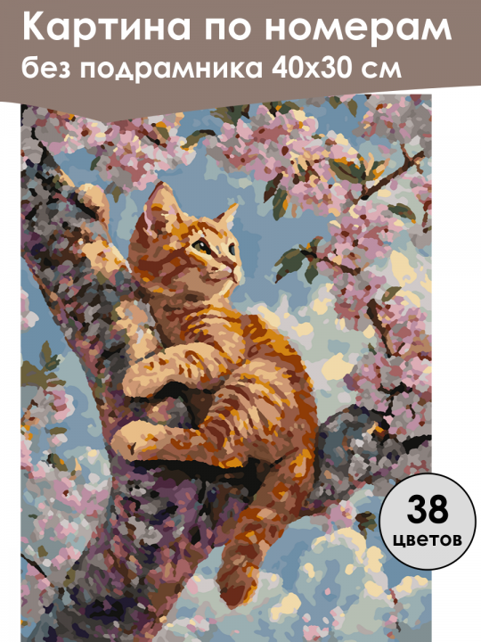 Картина по номерам без подрамника, размер 40х30 см, произведена нами. Она включает 40 оттенков и 3296 контуров, что придаёт ей глубину цвета и плавные переходы. Картина выглядит более ярко и живо. В комплект входит глянцевый лак, которым можно покрыть работу по желанию. Краски имеют хорошую укрывистость, хватает двух проходов что бы закрасить символы на схеме. Так же они сохраняют текстуру мазков, не растекаясь и не разглаживаясь полностью на холсте. При покрытии глянцевым лаком создаётся эффект приближенный к масляной живописи. Краски упакованы герметично, что сохраняет их жидкими. Все необходимые инструменты для начала работы также входят в комплект. Мы не используем экосольвентные чернила, которые содержат свинец и могут быть вредны для здоровья. Наши картины напечатаны безопасными водными пигментными чернилами, обеспечивающими чёткое изображение и легко читаемые обозначения. Холст плотный, имеет мелкую зернистость, легко разглаживается и устойчив к сминанию. Картина поставляется в бурой коробке. Следует отметить, что картина без подрамника её нельзя натянуть на подрамник из-за узких краёв, она предназначена для оформления в рамочку. Рыжий котёнок сидит на ветке дерева, окружённой цветущими розовыми цветами; он смотрит наверх, на голубое небо, создавая атмосферу весенней легкости и безмятежности.