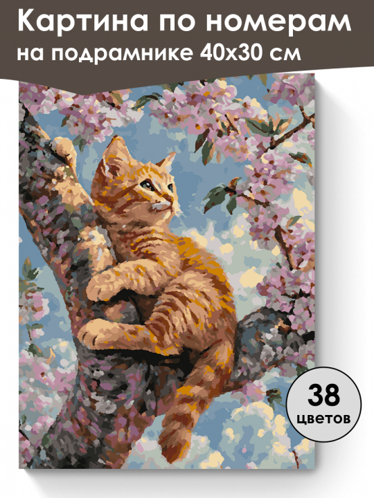 Картина по номерам на подрамнике, размер 40х30 см, произведена нами. Она включает 40 оттенков и 3296 контуров, что придаёт ей глубину цвета и плавные переходы. Картина выглядит более ярко и живо. В комплект входит глянцевый лак, которым можно покрыть работу по желанию. Краски имеют хорошую укрывистость, хватает двух проходов что бы закрасить символы на схеме. Так же они сохраняют текстуру мазков, не растекаясь и не разглаживаясь полностью на холсте. При покрытии глянцевым лаком создаётся эффект приближенный к масляной живописи. Краски упакованы герметично, что сохраняет их жидкими. Все необходимые инструменты для начала работы также включены в комплект, в том числе и крепления на стену. В картине используется крепкий подрамник со специальной вставкой, которая предотвращает провисание холста во время рисования. Это обеспечивает комфортный процесс работы и гарантирует, что холст всегда будет оставаться хорошо натянутым. Мы не используем экосольвентные чернила, которые содержат свинец и могут быть вредны для здоровья. Наши картины напечатаны безопасными водными пигментными чернилами, обеспечивающими чёткое изображение и легко читаемые обозначения. Холст плотный, имеет мелкую зернистость, легко разглаживается и устойчив к сминанию. Картина поставляется в защищённой бурой коробке. Рыжий котёнок сидит на ветке дерева, окружённой цветущими розовыми цветами; он смотрит наверх, на голубое небо, создавая атмосферу весенней легкости и безмятежности.