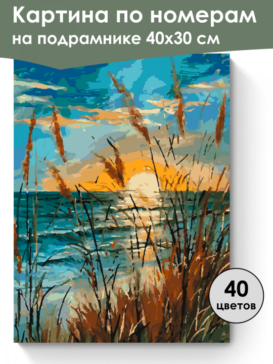 Картина по номерам на подрамнике, размер 40х30 см, произведена нами. Она включает 40 оттенков и 2694 контуров, что придаёт ей глубину цвета и плавные переходы. Картина выглядит более ярко и живо. В комплект входит глянцевый лак, которым можно покрыть работу по желанию. Краски имеют хорошую укрывистость, хватает двух проходов что бы закрасить символы на схеме. Так же они сохраняют текстуру мазков, не растекаясь и не разглаживаясь полностью на холсте. При покрытии глянцевым лаком создаётся эффект приближенный к масляной живописи. Краски упакованы герметично, что сохраняет их жидкими. Все необходимые инструменты для начала работы также включены в комплект, в том числе и крепления на стену. В картине используется крепкий подрамник со специальной вставкой, которая предотвращает провисание холста во время рисования. Это обеспечивает комфортный процесс работы и гарантирует, что холст всегда будет оставаться хорошо натянутым. Мы не используем экосольвентные чернила, которые содержат свинец и могут быть вредны для здоровья. Наши картины напечатаны безопасными водными пигментными чернилами, обеспечивающими чёткое изображение и легко читаемые обозначения. Холст плотный, имеет мелкую зернистость, легко разглаживается и устойчив к сминанию. Картина поставляется в защищённой бурой коробке. Красочный закат над морем с высокими травами на переднем плане, золотистые и синие оттенки плавно перемешиваются, создавая атмосферу покоя и гармонии.