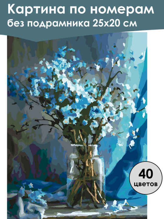 Картина по номерам без подрамника, размер 25х20 см, произведена нами. Она включает 40 оттенков и 1363 контуров, что придаёт ей глубину цвета и плавные переходы. Картина выглядит более ярко и живо. В комплект входит глянцевый лак, которым можно покрыть работу по желанию. Краски качественные, имеют хорошую укрывистость, хватает двух проходов что бы закрасить символы на схеме. Они упакованы герметично, что сохраняет их жидкими. Все необходимые инструменты для начала работы также включены в комплект. Мы не используем экосольвентные чернила, которые содержат свинец и могут быть вредны для здоровья. Наши картины напечатаны безопасными водными пигментными чернилами, обеспечивающими чёткое изображение и легко читаемые обозначения. Холст плотный, имеет мелкую зернистость, легко разглаживается и устойчив к сминанию. Картина поставляется в бурой коробке. Следует отметить, что картина без подрамника её нельзя натянуть на подрамник из-за узких краёв, она предназначена для оформления в рамочку. Стеклянная ваза с букетом голубых и белых цветов, которые стоят на деревянной поверхности, фон выполнен в оттенках синего и серого, создавая спокойную атмосферу с акварельным эффектом.