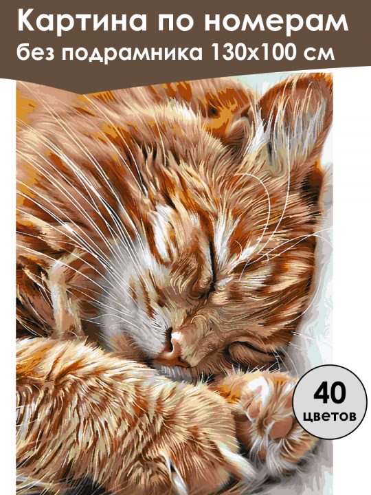 Картина по номерам без подрамника, размер 130х100 см, произведена нами. Она включает 40 оттенков и 8263 контуров, что придаёт ей глубину цвета и плавные переходы. Картина выглядит более ярко и живо. В комплект входит глянцевый лак, которым можно покрыть работу по желанию. Краски имеют хорошую укрывистость, хватает двух проходов что бы закрасить символы на схеме. Так же они сохраняют текстуру мазков, не растекаясь и не разглаживаясь полностью на холсте. При покрытии глянцевым лаком создаётся эффект приближенный к масляной живописи. Краски упакованы герметично, что сохраняет их жидкими. Все необходимые инструменты для начала работы также входят в комплект. Мы не используем экосольвентные чернила, которые содержат свинец и могут быть вредны для здоровья. Наши картины напечатаны безопасными водными пигментными чернилами, обеспечивающими чёткое изображение и легко читаемые обозначения. Холст плотный, имеет мелкую зернистость, легко разглаживается и устойчив к сминанию. Картина поставляется в защищённом буром тубусе. Следует отметить, что картина без подрамника её нельзя натянуть на подрамник из-за узких краёв, она предназначена для оформления в рамочку. Спящий рыжий кот с белыми усами, расположившийся головой на лапах; шерсть выполнена в оттенках коричневого, оранжевого и белого, создавая ощущение оттенков в масляной живописи.