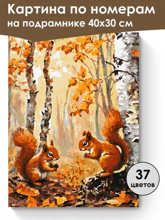 Картина по номерам на подрамнике, размер 40х30 см, произведена нами. Она включает 40 оттенков и 4030 контуров, что придаёт ей глубину цвета и плавные переходы. Картина выглядит более ярко и живо. В комплект входит глянцевый лак, которым можно покрыть работу по желанию. Краски имеют хорошую укрывистость, хватает двух проходов что бы закрасить символы на схеме. Так же они сохраняют текстуру мазков, не растекаясь и не разглаживаясь полностью на холсте. При покрытии глянцевым лаком создаётся эффект приближенный к масляной живописи. Краски упакованы герметично, что сохраняет их жидкими. Все необходимые инструменты для начала работы также включены в комплект, в том числе и крепления на стену. В картине используется крепкий подрамник со специальной вставкой, которая предотвращает провисание холста во время рисования. Это обеспечивает комфортный процесс работы и гарантирует, что холст всегда будет оставаться хорошо натянутым. Мы не используем экосольвентные чернила, которые содержат свинец и могут быть вредны для здоровья. Наши картины напечатаны безопасными водными пигментными чернилами, обеспечивающими чёткое изображение и легко читаемые обозначения. Холст плотный, имеет мелкую зернистость, легко разглаживается и устойчив к сминанию. Картина поставляется в защищённой бурой коробке. Две белки, окружённые осенними деревьями с оранжевыми и жёлтыми листьями; белки сидят напротив друг друга на земле, покрытой опавшими листьями, и как будто заняты чем-то в своих лапках, создавая атмосферу теплоты и уюта в осеннем лесу.
