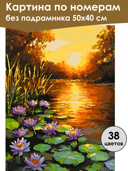 Картина по номерам без подрамника, размер 50х40 см, произведена нами. Она включает 40 оттенков и 2970 контуров, что придаёт ей глубину цвета и плавные переходы. Картина выглядит более ярко и живо. В комплект входит глянцевый лак, которым можно покрыть работу по желанию. Краски имеют хорошую укрывистость, хватает двух проходов что бы закрасить символы на схеме. Так же они сохраняют текстуру мазков, не растекаясь и не разглаживаясь полностью на холсте. При покрытии глянцевым лаком создаётся эффект приближенный к масляной живописи. Краски упакованы герметично, что сохраняет их жидкими. Все необходимые инструменты для начала работы также входят в комплект. Мы не используем экосольвентные чернила, которые содержат свинец и могут быть вредны для здоровья. Наши картины напечатаны безопасными водными пигментными чернилами, обеспечивающими чёткое изображение и легко читаемые обозначения. Холст плотный, имеет мелкую зернистость, легко разглаживается и устойчив к сминанию. Картина поставляется в бурой коробке. Следует отметить, что картина без подрамника её нельзя натянуть на подрамник из-за узких краёв, она предназначена для оформления в рамочку. Живописный закат на реке, где последние лучи солнца отражаются в воде, создавая яркие оттенки оранжевого и золотого; по левому берегу растут водяные лилии и тростник, придавая сцене атмосферу спокойствия и умиротворения.