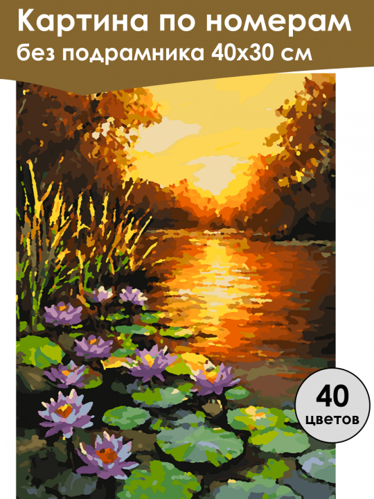 Картина по номерам без подрамника, размер 40х30 см, произведена нами. Она включает 40 оттенков и 2418 контуров, что придаёт ей глубину цвета и плавные переходы. Картина выглядит более ярко и живо. В комплект входит глянцевый лак, которым можно покрыть работу по желанию. Краски имеют хорошую укрывистость, хватает двух проходов что бы закрасить символы на схеме. Так же они сохраняют текстуру мазков, не растекаясь и не разглаживаясь полностью на холсте. При покрытии глянцевым лаком создаётся эффект приближенный к масляной живописи. Краски упакованы герметично, что сохраняет их жидкими. Все необходимые инструменты для начала работы также входят в комплект. Мы не используем экосольвентные чернила, которые содержат свинец и могут быть вредны для здоровья. Наши картины напечатаны безопасными водными пигментными чернилами, обеспечивающими чёткое изображение и легко читаемые обозначения. Холст плотный, имеет мелкую зернистость, легко разглаживается и устойчив к сминанию. Картина поставляется в бурой коробке. Следует отметить, что картина без подрамника её нельзя натянуть на подрамник из-за узких краёв, она предназначена для оформления в рамочку. Живописный закат на реке, где последние лучи солнца отражаются в воде, создавая яркие оттенки оранжевого и золотого; по левому берегу растут водяные лилии и тростник, придавая сцене атмосферу спокойствия и умиротворения.