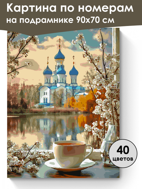 Картина по номерам на подрамнике, размер 90х70 см, произведена нами. Она включает 40 оттенков и 5577 контуров, что придаёт ей глубину цвета и плавные переходы. Картина выглядит более ярко и живо. В комплект входит глянцевый лак, которым можно покрыть работу по желанию. Краски имеют хорошую укрывистость, хватает двух проходов что бы закрасить символы на схеме. Так же они сохраняют текстуру мазков, не растекаясь и не разглаживаясь полностью на холсте. При покрытии глянцевым лаком создаётся эффект приближенный к масляной живописи. Краски упакованы герметично, что сохраняет их жидкими. Все необходимые инструменты для начала работы также включены в комплект, в том числе и крепления на стену. В картине используется крепкий подрамник со специальной вставкой, которая предотвращает провисание холста во время рисования. Это обеспечивает комфортный процесс работы и гарантирует, что холст всегда будет оставаться хорошо натянутым. Мы не используем экосольвентные чернила, которые содержат свинец и могут быть вредны для здоровья. Наши картины напечатаны безопасными водными пигментными чернилами, обеспечивающими чёткое изображение и легко читаемые обозначения. Холст плотный, имеет мелкую зернистость, легко разглаживается и устойчив к сминанию. Картина поставляется в защищённой бурой коробке. Стилизованная композиция, в центре которой находится чашка с напитком на блюдце, расположенная на фоне пейзажа с живописным храмом с голубыми куполами на другом берегу реки; по краям ветки с белыми цветами создают атмосферу весеннего уюта и гармонии.