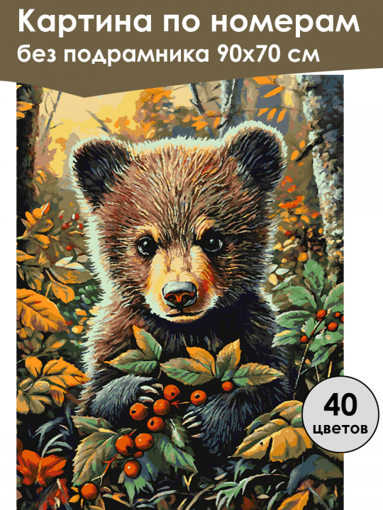 Картина по номерам без подрамника, размер 90х70 см, произведена нами. Она включает 40 оттенков и 8411 контуров, что придаёт ей глубину цвета и плавные переходы. Картина выглядит более ярко и живо. В комплект входит глянцевый лак, которым можно покрыть работу по желанию. Краски имеют хорошую укрывистость, хватает двух проходов что бы закрасить символы на схеме. Так же они сохраняют текстуру мазков, не растекаясь и не разглаживаясь полностью на холсте. При покрытии глянцевым лаком создаётся эффект приближенный к масляной живописи. Краски упакованы герметично, что сохраняет их жидкими. Все необходимые инструменты для начала работы также входят в комплект. Мы не используем экосольвентные чернила, которые содержат свинец и могут быть вредны для здоровья. Наши картины напечатаны безопасными водными пигментными чернилами, обеспечивающими чёткое изображение и легко читаемые обозначения. Холст плотный, имеет мелкую зернистость, легко разглаживается и устойчив к сминанию. Картина поставляется в защищённом буром тубусе. Следует отметить, что картина без подрамника её нельзя натянуть на подрамник из-за узких краёв, она предназначена для оформления в рамочку. Медвежонок в лесу, в окружении ярко-оранжевых и зеленых листьев и ягод, создавая атмосферу осени или лета; художник использует насыщенные цвета и контраст для создания впечатления глубины и реалистичности в мультяшном стиле.