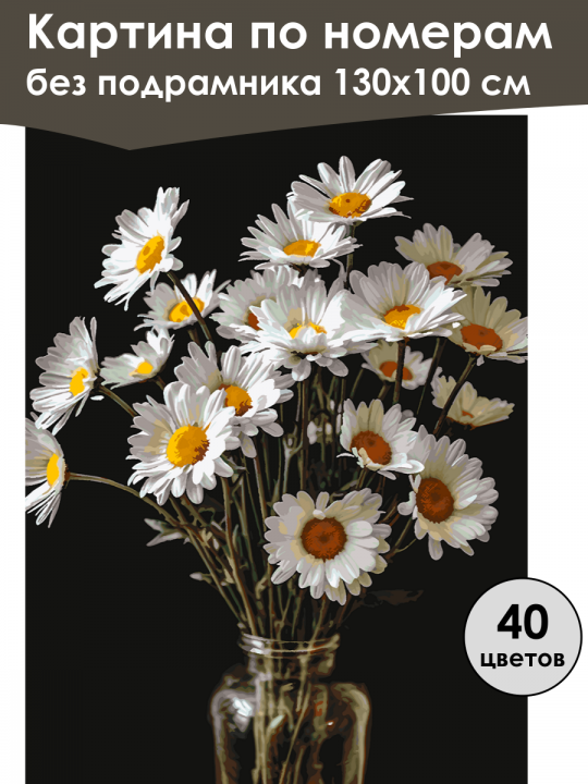 Картина по номерам без подрамника, размер 130х100 см, произведена нами. Она включает 40 оттенков и 3481 контуров, что придаёт ей глубину цвета и плавные переходы. Картина выглядит более ярко и живо. В комплект входит глянцевый лак, которым можно покрыть работу по желанию. Краски имеют хорошую укрывистость, хватает двух проходов что бы закрасить символы на схеме. Так же они сохраняют текстуру мазков, не растекаясь и не разглаживаясь полностью на холсте. При покрытии глянцевым лаком создаётся эффект приближенный к масляной живописи. Краски упакованы герметично, что сохраняет их жидкими. Все необходимые инструменты для начала работы также входят в комплект. Мы не используем экосольвентные чернила, которые содержат свинец и могут быть вредны для здоровья. Наши картины напечатаны безопасными водными пигментными чернилами, обеспечивающими чёткое изображение и легко читаемые обозначения. Холст плотный, имеет мелкую зернистость, легко разглаживается и устойчив к сминанию. Картина поставляется в защищённом буром тубусе. Следует отметить, что картина без подрамника её нельзя натянуть на подрамник из-за узких краёв, она предназначена для оформления в рамочку. Букет ромашек в стеклянной вазе на тёмном фоне, цветы имеют белые лепестки и жёлтые сердцевины, колышутся на длинных стеблях, создавая ощущение лёгкости и свежести.