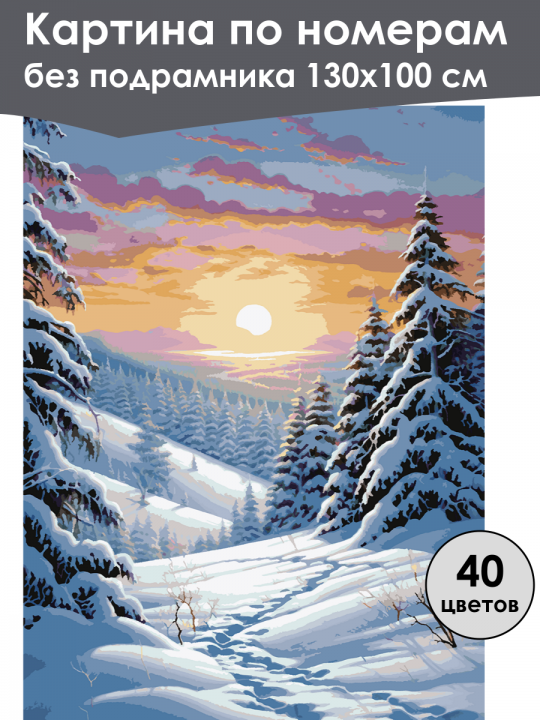 Картина по номерам без подрамника, размер 130х100 см, произведена нами. Она включает 40 оттенков и 3874 контуров, что придаёт ей глубину цвета и плавные переходы. Картина выглядит более ярко и живо. В комплект входит глянцевый лак, которым можно покрыть работу по желанию. Краски имеют хорошую укрывистость, хватает двух проходов что бы закрасить символы на схеме. Так же они сохраняют текстуру мазков, не растекаясь и не разглаживаясь полностью на холсте. При покрытии глянцевым лаком создаётся эффект приближенный к масляной живописи. Краски упакованы герметично, что сохраняет их жидкими. Все необходимые инструменты для начала работы также входят в комплект. Мы не используем экосольвентные чернила, которые содержат свинец и могут быть вредны для здоровья. Наши картины напечатаны безопасными водными пигментными чернилами, обеспечивающими чёткое изображение и легко читаемые обозначения. Холст плотный, имеет мелкую зернистость, легко разглаживается и устойчив к сминанию. Картина поставляется в защищённом буром тубусе. Следует отметить, что картина без подрамника её нельзя натянуть на подрамник из-за узких краёв, она предназначена для оформления в рамочку. Заснеженный пейзаж с густыми елями, покрытыми снегом, высокие деревья окружают снежную долину, а на фоне восходит яркое солнце, окрашивая небо в мягкие розовые и оранжевые оттенки, создавая атмосферу зимнего утра.