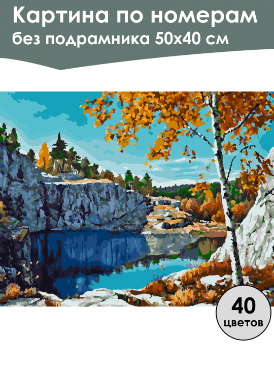 Картина по номерам без подрамника, размер 50х40 см, произведена нами. Она включает 40 оттенков и 3735 контуров, что придаёт ей глубину цвета и плавные переходы. Картина выглядит более ярко и живо. В комплект входит глянцевый лак, которым можно покрыть работу по желанию. Краски имеют хорошую укрывистость, хватает двух проходов что бы закрасить символы на схеме. Так же они сохраняют текстуру мазков, не растекаясь и не разглаживаясь полностью на холсте. При покрытии глянцевым лаком создаётся эффект приближенный к масляной живописи. Краски упакованы герметично, что сохраняет их жидкими. Все необходимые инструменты для начала работы также входят в комплект. Мы не используем экосольвентные чернила, которые содержат свинец и могут быть вредны для здоровья. Наши картины напечатаны безопасными водными пигментными чернилами, обеспечивающими чёткое изображение и легко читаемые обозначения. Холст плотный, имеет мелкую зернистость, легко разглаживается и устойчив к сминанию. Картина поставляется в бурой коробке. Следует отметить, что картина без подрамника её нельзя натянуть на подрамник из-за узких краёв, она предназначена для оформления в рамочку. Живописный осенний пейзаж: голубое небо, скалистые утёсы, спокойная поверхность воды, отражающая яркие осенние листья деревьев с золотистой листвой, стоящих на переднем плане; деревья и кустарники на заднем фоне добавляют глубину картине.