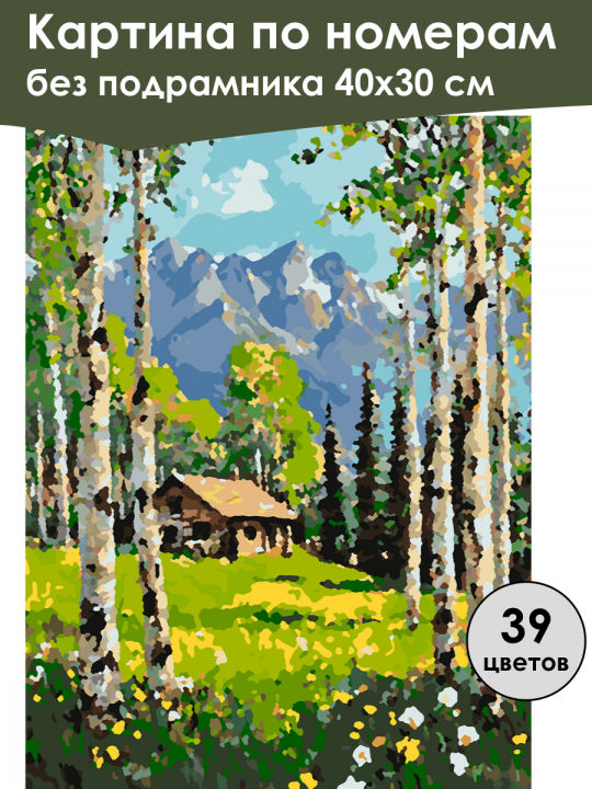 Картина по номерам без подрамника, размер 40х30 см, произведена нами. Она включает 40 оттенков и 3491 контуров, что придаёт ей глубину цвета и плавные переходы. Картина выглядит более ярко и живо. В комплект входит глянцевый лак, которым можно покрыть работу по желанию. Краски имеют хорошую укрывистость, хватает двух проходов что бы закрасить символы на схеме. Так же они сохраняют текстуру мазков, не растекаясь и не разглаживаясь полностью на холсте. При покрытии глянцевым лаком создаётся эффект приближенный к масляной живописи. Краски упакованы герметично, что сохраняет их жидкими. Все необходимые инструменты для начала работы также входят в комплект. Мы не используем экосольвентные чернила, которые содержат свинец и могут быть вредны для здоровья. Наши картины напечатаны безопасными водными пигментными чернилами, обеспечивающими чёткое изображение и легко читаемые обозначения. Холст плотный, имеет мелкую зернистость, легко разглаживается и устойчив к сминанию. Картина поставляется в бурой коробке. Следует отметить, что картина без подрамника её нельзя натянуть на подрамник из-за узких краёв, она предназначена для оформления в рамочку. Живописный пейзаж с деревянным домиком, окруженным зелёной лужайкой и цветами, на фоне высоких сосен и гор, под светлым голубым небом; в переднем плане видны стройные берёзы, создающие атмосферу уединения и гармонии с природой.