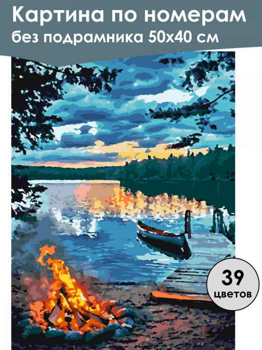 Картина по номерам без подрамника, размер 50х40 см, произведена нами. Она включает 40 оттенков и 2833 контуров, что придаёт ей глубину цвета и плавные переходы. Картина выглядит более ярко и живо. В комплект входит глянцевый лак, которым можно покрыть работу по желанию. Краски имеют хорошую укрывистость, хватает двух проходов что бы закрасить символы на схеме. Так же они сохраняют текстуру мазков, не растекаясь и не разглаживаясь полностью на холсте. При покрытии глянцевым лаком создаётся эффект приближенный к масляной живописи. Краски упакованы герметично, что сохраняет их жидкими. Все необходимые инструменты для начала работы также входят в комплект. Мы не используем экосольвентные чернила, которые содержат свинец и могут быть вредны для здоровья. Наши картины напечатаны безопасными водными пигментными чернилами, обеспечивающими чёткое изображение и легко читаемые обозначения. Холст плотный, имеет мелкую зернистость, легко разглаживается и устойчив к сминанию. Картина поставляется в бурой коробке. Следует отметить, что картина без подрамника её нельзя натянуть на подрамник из-за узких краёв, она предназначена для оформления в рамочку. Художественное изображение лагерного костра у озера на фоне заката, с лодкой у причала, окруженного деревьями, небо покрыто облаками, а пейзаж отражается в воде, создавая атмосферу спокойствия и уюта.