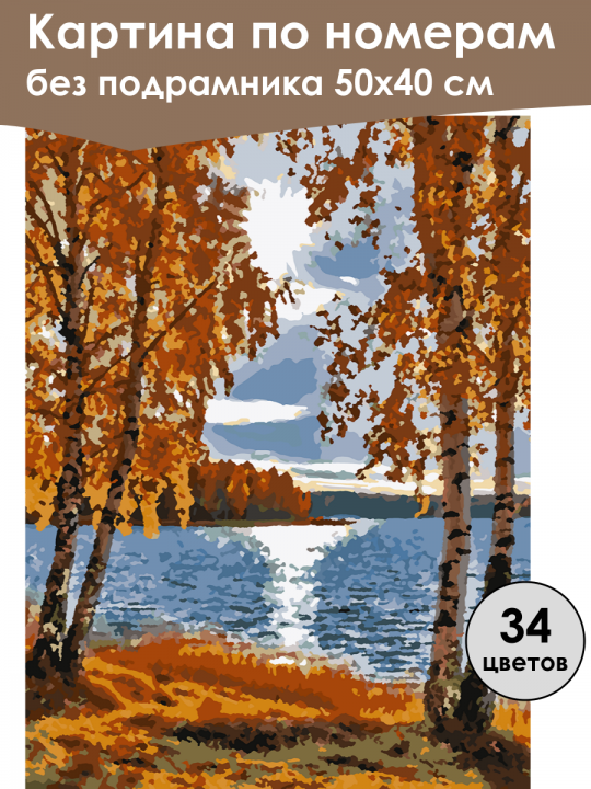 Картина по номерам без подрамника, размер 50х40 см, произведена нами. Она включает 40 оттенков и 3644 контуров, что придаёт ей глубину цвета и плавные переходы. Картина выглядит более ярко и живо. В комплект входит глянцевый лак, которым можно покрыть работу по желанию. Краски имеют хорошую укрывистость, хватает двух проходов что бы закрасить символы на схеме. Так же они сохраняют текстуру мазков, не растекаясь и не разглаживаясь полностью на холсте. При покрытии глянцевым лаком создаётся эффект приближенный к масляной живописи. Краски упакованы герметично, что сохраняет их жидкими. Все необходимые инструменты для начала работы также входят в комплект. Мы не используем экосольвентные чернила, которые содержат свинец и могут быть вредны для здоровья. Наши картины напечатаны безопасными водными пигментными чернилами, обеспечивающими чёткое изображение и легко читаемые обозначения. Холст плотный, имеет мелкую зернистость, легко разглаживается и устойчив к сминанию. Картина поставляется в бурой коробке. Следует отметить, что картина без подрамника её нельзя натянуть на подрамник из-за узких краёв, она предназначена для оформления в рамочку. Осенний пейзаж: берег озера, окружённый деревьями с золотистыми листьями, отражающими свет солнца в воде.