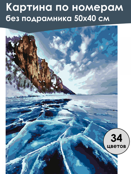 Картина по номерам без подрамника, размер 50х40 см, произведена нами. Она включает 40 оттенков и 2468 контуров, что придаёт ей глубину цвета и плавные переходы. Картина выглядит более ярко и живо. В комплект входит глянцевый лак, которым можно покрыть работу по желанию. Краски имеют хорошую укрывистость, хватает двух проходов что бы закрасить символы на схеме. Так же они сохраняют текстуру мазков, не растекаясь и не разглаживаясь полностью на холсте. При покрытии глянцевым лаком создаётся эффект приближенный к масляной живописи. Краски упакованы герметично, что сохраняет их жидкими. Все необходимые инструменты для начала работы также входят в комплект. Мы не используем экосольвентные чернила, которые содержат свинец и могут быть вредны для здоровья. Наши картины напечатаны безопасными водными пигментными чернилами, обеспечивающими чёткое изображение и легко читаемые обозначения. Холст плотный, имеет мелкую зернистость, легко разглаживается и устойчив к сминанию. Картина поставляется в бурой коробке. Следует отметить, что картина без подрамника её нельзя натянуть на подрамник из-за узких краёв, она предназначена для оформления в рамочку. Колоритный ландшафт с ледяной поверхностью, покрытой трещинами, которая ведет к зазубренной скале коричневого оттенка слева, под мрачным синим небом с движущимися облаками, создавая впечатление холодного и величественного природного зрелища.