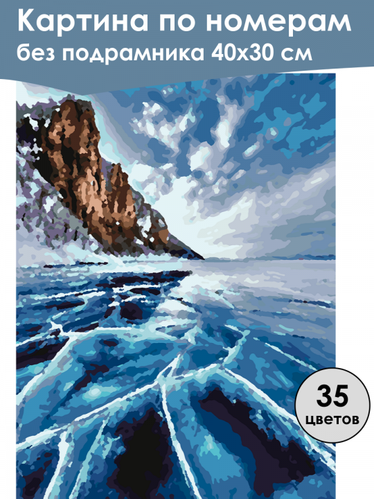 Картина по номерам без подрамника, размер 40х30 см, произведена нами. Она включает 40 оттенков и 2068 контуров, что придаёт ей глубину цвета и плавные переходы. Картина выглядит более ярко и живо. В комплект входит глянцевый лак, которым можно покрыть работу по желанию. Краски имеют хорошую укрывистость, хватает двух проходов что бы закрасить символы на схеме. Так же они сохраняют текстуру мазков, не растекаясь и не разглаживаясь полностью на холсте. При покрытии глянцевым лаком создаётся эффект приближенный к масляной живописи. Краски упакованы герметично, что сохраняет их жидкими. Все необходимые инструменты для начала работы также входят в комплект. Мы не используем экосольвентные чернила, которые содержат свинец и могут быть вредны для здоровья. Наши картины напечатаны безопасными водными пигментными чернилами, обеспечивающими чёткое изображение и легко читаемые обозначения. Холст плотный, имеет мелкую зернистость, легко разглаживается и устойчив к сминанию. Картина поставляется в бурой коробке. Следует отметить, что картина без подрамника её нельзя натянуть на подрамник из-за узких краёв, она предназначена для оформления в рамочку. Колоритный ландшафт с ледяной поверхностью, покрытой трещинами, которая ведет к зазубренной скале коричневого оттенка слева, под мрачным синим небом с движущимися облаками, создавая впечатление холодного и величественного природного зрелища.