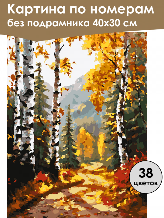 Картина по номерам без подрамника, размер 40х30 см, произведена нами. Она включает 40 оттенков и 3265 контуров, что придаёт ей глубину цвета и плавные переходы. Картина выглядит более ярко и живо. В комплект входит глянцевый лак, которым можно покрыть работу по желанию. Краски имеют хорошую укрывистость, хватает двух проходов что бы закрасить символы на схеме. Так же они сохраняют текстуру мазков, не растекаясь и не разглаживаясь полностью на холсте. При покрытии глянцевым лаком создаётся эффект приближенный к масляной живописи. Краски упакованы герметично, что сохраняет их жидкими. Все необходимые инструменты для начала работы также входят в комплект. Мы не используем экосольвентные чернила, которые содержат свинец и могут быть вредны для здоровья. Наши картины напечатаны безопасными водными пигментными чернилами, обеспечивающими чёткое изображение и легко читаемые обозначения. Холст плотный, имеет мелкую зернистость, легко разглаживается и устойчив к сминанию. Картина поставляется в бурой коробке. Следует отметить, что картина без подрамника её нельзя натянуть на подрамник из-за узких краёв, она предназначена для оформления в рамочку. Осенний лес с высокими берёзами и хвойными деревьями, окружённый яркими жёлто-оранжевыми листьями, создающими атмосферу солнечного, тёплого дня; на заднем плане видны горы, добавляющие глубину и величественность пейзажу.