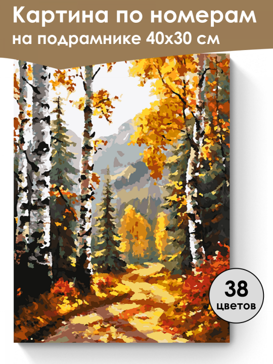 Картина по номерам на подрамнике, размер 40х30 см, произведена нами. Она включает 40 оттенков и 3265 контуров, что придаёт ей глубину цвета и плавные переходы. Картина выглядит более ярко и живо. В комплект входит глянцевый лак, которым можно покрыть работу по желанию. Краски имеют хорошую укрывистость, хватает двух проходов что бы закрасить символы на схеме. Так же они сохраняют текстуру мазков, не растекаясь и не разглаживаясь полностью на холсте. При покрытии глянцевым лаком создаётся эффект приближенный к масляной живописи. Краски упакованы герметично, что сохраняет их жидкими. Все необходимые инструменты для начала работы также включены в комплект, в том числе и крепления на стену. В картине используется крепкий подрамник со специальной вставкой, которая предотвращает провисание холста во время рисования. Это обеспечивает комфортный процесс работы и гарантирует, что холст всегда будет оставаться хорошо натянутым. Мы не используем экосольвентные чернила, которые содержат свинец и могут быть вредны для здоровья. Наши картины напечатаны безопасными водными пигментными чернилами, обеспечивающими чёткое изображение и легко читаемые обозначения. Холст плотный, имеет мелкую зернистость, легко разглаживается и устойчив к сминанию. Картина поставляется в защищённой бурой коробке. Осенний лес с высокими берёзами и хвойными деревьями, окружённый яркими жёлто-оранжевыми листьями, создающими атмосферу солнечного, тёплого дня; на заднем плане видны горы, добавляющие глубину и величественность пейзажу.