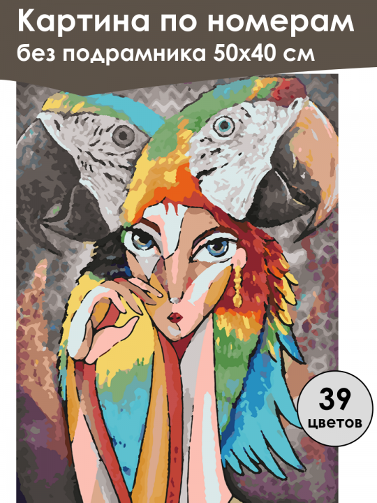 Картина по номерам без подрамника, размер 50х40 см, произведена нами. Она включает 40 оттенков и 1941 контуров, что придаёт ей глубину цвета и плавные переходы. Картина выглядит более ярко и живо. В комплект входит глянцевый лак, которым можно покрыть работу по желанию. Краски имеют хорошую укрывистость, хватает двух проходов что бы закрасить символы на схеме. Так же они сохраняют текстуру мазков, не растекаясь и не разглаживаясь полностью на холсте. При покрытии глянцевым лаком создаётся эффект приближенный к масляной живописи. Краски упакованы герметично, что сохраняет их жидкими. Все необходимые инструменты для начала работы также входят в комплект. Мы не используем экосольвентные чернила, которые содержат свинец и могут быть вредны для здоровья. Наши картины напечатаны безопасными водными пигментными чернилами, обеспечивающими чёткое изображение и легко читаемые обозначения. Холст плотный, имеет мелкую зернистость, легко разглаживается и устойчив к сминанию. Картина поставляется в бурой коробке. Следует отметить, что картина без подрамника её нельзя натянуть на подрамник из-за узких краёв, она предназначена для оформления в рамочку. Художественная интерпретация женского портрета, совмещённого с изображением двух красочных попугаев-ара; голова женщины плавно переходит в оперенье птиц, создавая яркий образ с использованием множества насыщенных цветов, таких как красный, синий, зелёный и жёлтый, подчёркнутых графичными линиями и контрастными тенями.
