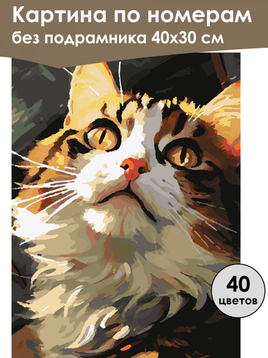 Картина по номерам без подрамника, размер 40х30 см, произведена нами. Она включает 40 оттенков и 1484 контуров, что придаёт ей глубину цвета и плавные переходы. Картина выглядит более ярко и живо. В комплект входит глянцевый лак, которым можно покрыть работу по желанию. Краски имеют хорошую укрывистость, хватает двух проходов что бы закрасить символы на схеме. Так же они сохраняют текстуру мазков, не растекаясь и не разглаживаясь полностью на холсте. При покрытии глянцевым лаком создаётся эффект приближенный к масляной живописи. Краски упакованы герметично, что сохраняет их жидкими. Все необходимые инструменты для начала работы также входят в комплект. Мы не используем экосольвентные чернила, которые содержат свинец и могут быть вредны для здоровья. Наши картины напечатаны безопасными водными пигментными чернилами, обеспечивающими чёткое изображение и легко читаемые обозначения. Холст плотный, имеет мелкую зернистость, легко разглаживается и устойчив к сминанию. Картина поставляется в бурой коробке. Следует отметить, что картина без подрамника её нельзя натянуть на подрамник из-за узких краёв, она предназначена для оформления в рамочку. Крупный план морды кота, выполненный в стилизованной живописной манере, с выделением контуров; у кота пушистая шерсть, большие выразительные глаза с вертикальными зрачками, розовый нос и длинные усы, задний фон затемнённый.