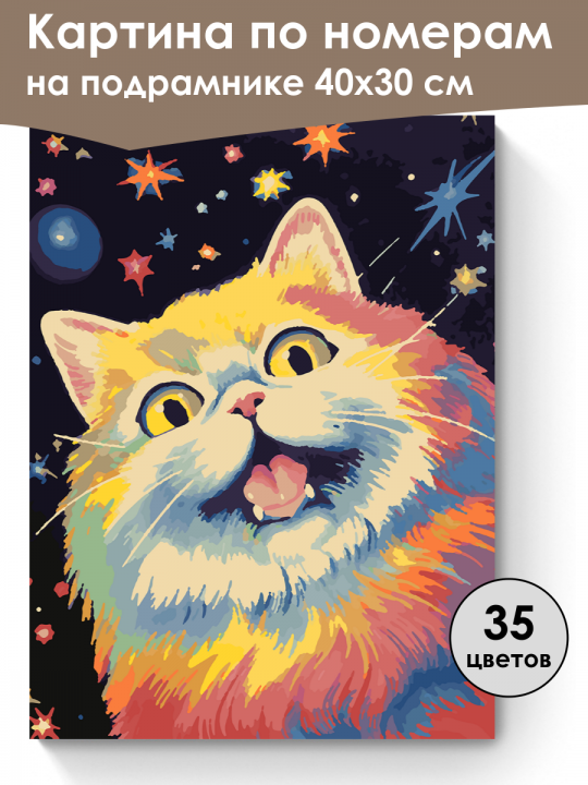 Картина по номерам на подрамнике, размер 40х30 см, произведена нами. Она включает 40 оттенков и 1155 контуров, что придаёт ей глубину цвета и плавные переходы. Картина выглядит более ярко и живо. В комплект входит глянцевый лак, которым можно покрыть работу по желанию. Краски имеют хорошую укрывистость, хватает двух проходов что бы закрасить символы на схеме. Так же они сохраняют текстуру мазков, не растекаясь и не разглаживаясь полностью на холсте. При покрытии глянцевым лаком создаётся эффект приближенный к масляной живописи. Краски упакованы герметично, что сохраняет их жидкими. Все необходимые инструменты для начала работы также включены в комплект, в том числе и крепления на стену. В картине используется крепкий подрамник со специальной вставкой, которая предотвращает провисание холста во время рисования. Это обеспечивает комфортный процесс работы и гарантирует, что холст всегда будет оставаться хорошо натянутым. Мы не используем экосольвентные чернила, которые содержат свинец и могут быть вредны для здоровья. Наши картины напечатаны безопасными водными пигментными чернилами, обеспечивающими чёткое изображение и легко читаемые обозначения. Холст плотный, имеет мелкую зернистость, легко разглаживается и устойчив к сминанию. Картина поставляется в защищённой бурой коробке. Цветной кот с удивлённым выражением лица смотрит вверх на звёздное небо, насыщенное красочными звёздами и планетами, что придаёт сцене атмосферу фантазийной галактики.