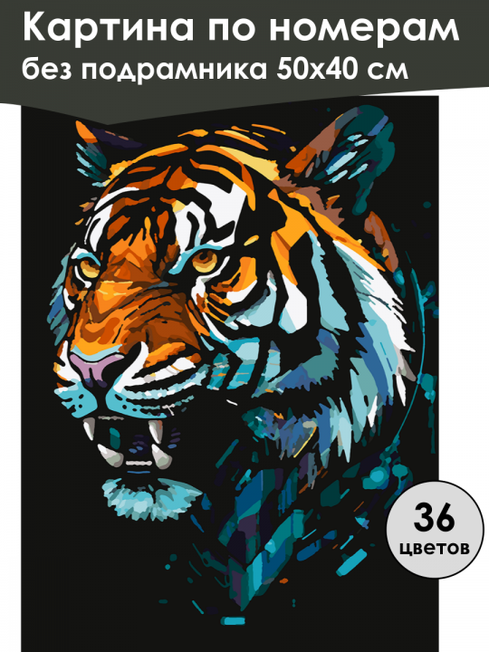 Картина по номерам без подрамника, размер 50х40 см, произведена нами. Она включает 40 оттенков и 920 контуров, что придаёт ей глубину цвета и плавные переходы. Картина выглядит более ярко и живо. В комплект входит глянцевый лак, которым можно покрыть работу по желанию. Краски имеют хорошую укрывистость, хватает двух проходов что бы закрасить символы на схеме. Так же они сохраняют текстуру мазков, не растекаясь и не разглаживаясь полностью на холсте. При покрытии глянцевым лаком создаётся эффект приближенный к масляной живописи. Краски упакованы герметично, что сохраняет их жидкими. Все необходимые инструменты для начала работы также входят в комплект. Мы не используем экосольвентные чернила, которые содержат свинец и могут быть вредны для здоровья. Наши картины напечатаны безопасными водными пигментными чернилами, обеспечивающими чёткое изображение и легко читаемые обозначения. Холст плотный, имеет мелкую зернистость, легко разглаживается и устойчив к сминанию. Картина поставляется в бурой коробке. Следует отметить, что картина без подрамника её нельзя натянуть на подрамник из-за узких краёв, она предназначена для оформления в рамочку. Иллюстрация величественной тигриной головы на тёмном фоне выполнена в ярких контрастных цветах, включая оранжевый, белый, синий и чёрный; детали подчёркивают текстуру меха, а выразительные глаза и оскаленные клыки добавляют драматичности.