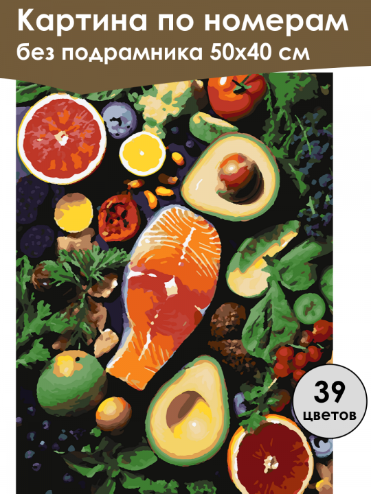 Картина по номерам без подрамника, размер 50х40 см, произведена нами. Она включает 40 оттенков и 2067 контуров, что придаёт ей глубину цвета и плавные переходы. Картина выглядит более ярко и живо. В комплект входит глянцевый лак, которым можно покрыть работу по желанию. Краски имеют хорошую укрывистость, хватает двух проходов что бы закрасить символы на схеме. Так же они сохраняют текстуру мазков, не растекаясь и не разглаживаясь полностью на холсте. При покрытии глянцевым лаком создаётся эффект приближенный к масляной живописи. Краски упакованы герметично, что сохраняет их жидкими. Все необходимые инструменты для начала работы также входят в комплект. Мы не используем экосольвентные чернила, которые содержат свинец и могут быть вредны для здоровья. Наши картины напечатаны безопасными водными пигментными чернилами, обеспечивающими чёткое изображение и легко читаемые обозначения. Холст плотный, имеет мелкую зернистость, легко разглаживается и устойчив к сминанию. Картина поставляется в бурой коробке. Следует отметить, что картина без подрамника её нельзя натянуть на подрамник из-за узких краёв, она предназначена для оформления в рамочку. Живописный натюрморт с различными продуктами: в центре крупный кусок лосося, обрамлённый половинками авокадо, ломтиками цитрусовых, помидорами, грейпфрутом, лимоном и зеленью, создающими гармоничную цветовую палитру на тёмном фоне.