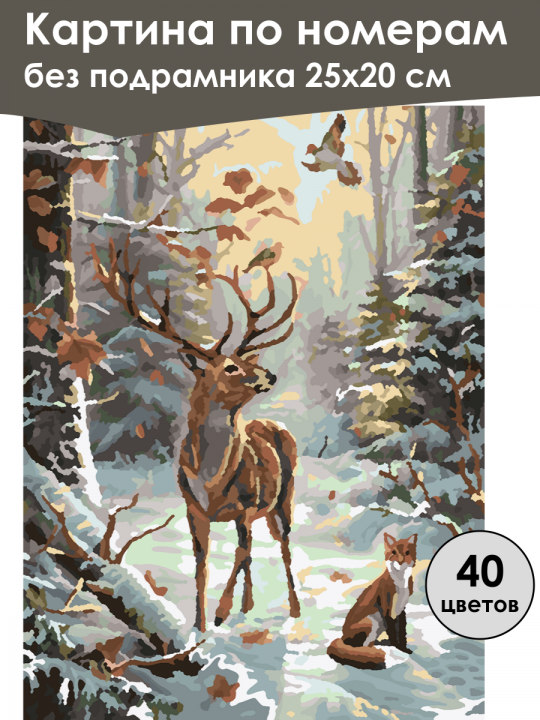 Картина по номерам без подрамника, размер 25х20 см, произведена нами. Она включает 40 оттенков и 1926 контуров, что придаёт ей глубину цвета и плавные переходы. Картина выглядит более ярко и живо. В комплект входит глянцевый лак, которым можно покрыть работу по желанию. Краски качественные, имеют хорошую укрывистость, хватает двух проходов что бы закрасить символы на схеме. Они упакованы герметично, что сохраняет их жидкими. Все необходимые инструменты для начала работы также включены в комплект. Мы не используем экосольвентные чернила, которые содержат свинец и могут быть вредны для здоровья. Наши картины напечатаны безопасными водными пигментными чернилами, обеспечивающими чёткое изображение и легко читаемые обозначения. Холст плотный, имеет мелкую зернистость, легко разглаживается и устойчив к сминанию. Картина поставляется в бурой коробке. Следует отметить, что картина без подрамника её нельзя натянуть на подрамник из-за узких краёв, она предназначена для оформления в рамочку. В зимнем лесу под светлым небом с редкими облаками изображён олень, стоящий на покрытой снегом земле; его окружает спокойная природная атмосфера, дополненная парящими в воздухе птицами и любопытной лисой, сидящей рядом, создавая ощущение гармоничного сосуществования дикой природы.