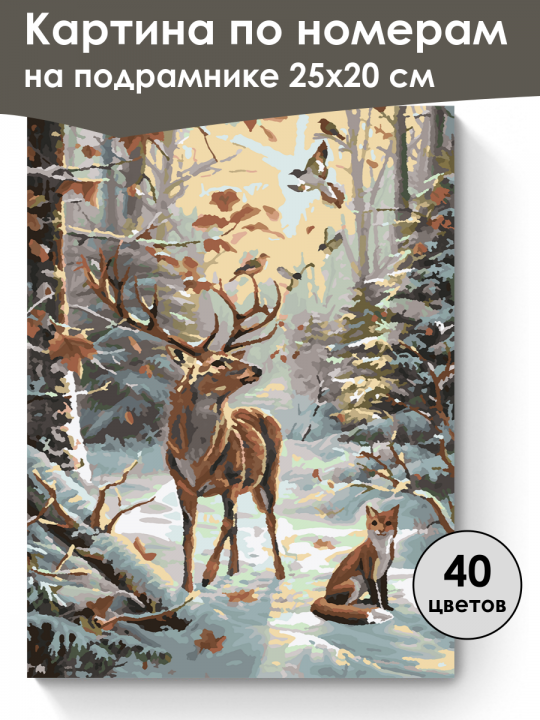 Картина по номерам на подрамнике, размер 25х20 см, произведена нами. Она включает 40 оттенков и 1926 контуров, что придаёт ей глубину цвета и плавные переходы. Картина выглядит более ярко и живо. В комплект входит глянцевый лак, которым можно покрыть работу по желанию. Краски имеют хорошую укрывистость, хватает двух проходов что бы закрасить символы на схеме. Так же они сохраняют текстуру мазков, не растекаясь и не разглаживаясь полностью на холсте. При покрытии глянцевым лаком создаётся эффект приближенный к масляной живописи. Краски упакованы герметично, что сохраняет их жидкими. Все необходимые инструменты для начала работы также включены в комплект, в том числе и крепления на стену. В картине используется крепкий подрамник со специальной вставкой, которая предотвращает провисание холста во время рисования. Это обеспечивает комфортный процесс работы и гарантирует, что холст всегда будет оставаться хорошо натянутым. Мы не используем экосольвентные чернила, которые содержат свинец и могут быть вредны для здоровья. Наши картины напечатаны безопасными водными пигментными чернилами, обеспечивающими чёткое изображение и легко читаемые обозначения. Холст плотный, имеет мелкую зернистость, легко разглаживается и устойчив к сминанию. Картина поставляется в защищённой бурой коробке. В зимнем лесу под светлым небом с редкими облаками изображён олень, стоящий на покрытой снегом земле; его окружает спокойная природная атмосфера, дополненная парящими в воздухе птицами и любопытной лисой, сидящей рядом, создавая ощущение гармоничного сосуществования дикой природы.