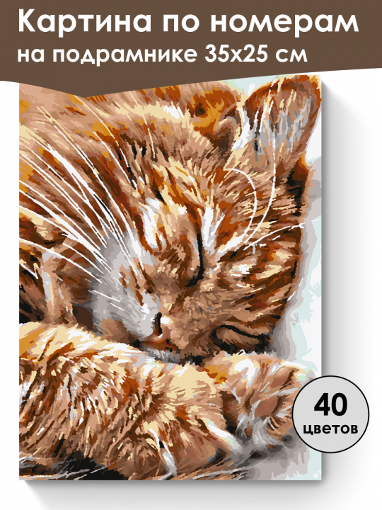 Картина по номерам на подрамнике, размер 35х25 см, произведена нами. Она включает 40 оттенков и 3359 контуров, что придаёт ей глубину цвета и плавные переходы. Картина выглядит более ярко и живо. В комплект входит глянцевый лак, которым можно покрыть работу по желанию. Краски имеют хорошую укрывистость, хватает двух проходов что бы закрасить символы на схеме. Так же они сохраняют текстуру мазков, не растекаясь и не разглаживаясь полностью на холсте. При покрытии глянцевым лаком создаётся эффект приближенный к масляной живописи. Краски упакованы герметично, что сохраняет их жидкими. Все необходимые инструменты для начала работы также включены в комплект, в том числе и крепления на стену. В картине используется крепкий подрамник со специальной вставкой, которая предотвращает провисание холста во время рисования. Это обеспечивает комфортный процесс работы и гарантирует, что холст всегда будет оставаться хорошо натянутым. Мы не используем экосольвентные чернила, которые содержат свинец и могут быть вредны для здоровья. Наши картины напечатаны безопасными водными пигментными чернилами, обеспечивающими чёткое изображение и легко читаемые обозначения. Холст плотный, имеет мелкую зернистость, легко разглаживается и устойчив к сминанию. Картина поставляется в защищённой бурой коробке. Спящий рыжий кот с белыми усами, расположившийся головой на лапах; шерсть выполнена в оттенках коричневого, оранжевого и белого, создавая ощущение оттенков в масляной живописи.