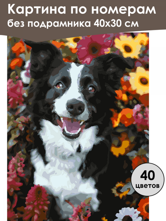Картина по номерам без подрамника, размер 40х30 см, произведена нами. Она включает 40 оттенков и 2021 контуров, что придаёт ей глубину цвета и плавные переходы. Картина выглядит более ярко и живо. В комплект входит глянцевый лак, которым можно покрыть работу по желанию. Краски имеют хорошую укрывистость, хватает двух проходов что бы закрасить символы на схеме. Так же они сохраняют текстуру мазков, не растекаясь и не разглаживаясь полностью на холсте. При покрытии глянцевым лаком создаётся эффект приближенный к масляной живописи. Краски упакованы герметично, что сохраняет их жидкими. Все необходимые инструменты для начала работы также входят в комплект. Мы не используем экосольвентные чернила, которые содержат свинец и могут быть вредны для здоровья. Наши картины напечатаны безопасными водными пигментными чернилами, обеспечивающими чёткое изображение и легко читаемые обозначения. Холст плотный, имеет мелкую зернистость, легко разглаживается и устойчив к сминанию. Картина поставляется в бурой коробке. Следует отметить, что картина без подрамника её нельзя натянуть на подрамник из-за узких краёв, она предназначена для оформления в рамочку. Стилизованная собака с чёрно-белой шерстью, возможно бордер-колли, с открытой пастью и обрадованным выражением лица, окружённая яркими цветами красного, жёлтого и оранжевого оттенков на фоне, создающими живописный и радостный вид.