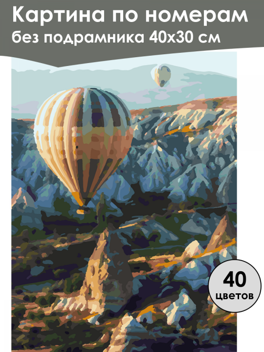 Картина по номерам без подрамника, размер 40х30 см, произведена нами. Она включает 40 оттенков и 1967 контуров, что придаёт ей глубину цвета и плавные переходы. Картина выглядит более ярко и живо. В комплект входит глянцевый лак, которым можно покрыть работу по желанию. Краски имеют хорошую укрывистость, хватает двух проходов что бы закрасить символы на схеме. Так же они сохраняют текстуру мазков, не растекаясь и не разглаживаясь полностью на холсте. При покрытии глянцевым лаком создаётся эффект приближенный к масляной живописи. Краски упакованы герметично, что сохраняет их жидкими. Все необходимые инструменты для начала работы также входят в комплект. Мы не используем экосольвентные чернила, которые содержат свинец и могут быть вредны для здоровья. Наши картины напечатаны безопасными водными пигментными чернилами, обеспечивающими чёткое изображение и легко читаемые обозначения. Холст плотный, имеет мелкую зернистость, легко разглаживается и устойчив к сминанию. Картина поставляется в бурой коробке. Следует отметить, что картина без подрамника её нельзя натянуть на подрамник из-за узких краёв, она предназначена для оформления в рамочку. Два воздушных шара, парящих над живописным ландшафтом с горными формациями и глубокими ущельями, залитыми мягким светом, создающим атмосферу спокойствия и красоты.