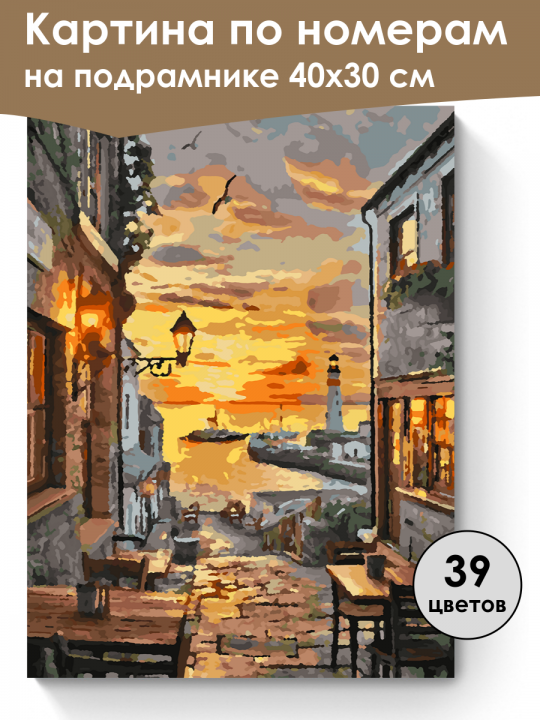 Картина по номерам на подрамнике, размер 40х30 см, произведена нами. Она включает 39 оттенков и 2909 контуров, что придаёт ей глубину цвета и плавные переходы. Картина выглядит более ярко и живо. В комплект входит глянцевый лак, которым можно покрыть работу по желанию. Краски имеют хорошую укрывистость, хватает двух проходов что бы закрасить символы на схеме. Так же они сохраняют текстуру мазков, не растекаясь и не разглаживаясь полностью на холсте. При покрытии глянцевым лаком создаётся эффект приближенный к масляной живописи. Краски упакованы герметично, что сохраняет их жидкими. Все необходимые инструменты для начала работы также включены в комплект, в том числе и крепления на стену. В картине используется крепкий подрамник со специальной вставкой, которая предотвращает провисание холста во время рисования. Это обеспечивает комфортный процесс работы и гарантирует, что холст всегда будет оставаться хорошо натянутым. Мы не используем экосольвентные чернила, которые содержат свинец и могут быть вредны для здоровья. Наши картины напечатаны безопасными водными пигментными чернилами, обеспечивающими чёткое изображение и легко читаемые обозначения. Холст плотный, имеет мелкую зернистость, легко разглаживается и устойчив к сминанию. Картина поставляется в защищённой бурой коробке. Узкая мощеная улица, ведущая к морю, на горизонте виден маяк и корабль; вокруг расположены уютные дома с яркими окнами и уличными лампами, а небо окрашено в теплые цвета заката, дополняя атмосферу уюта и спокойствия, создаваемую несколькими летящими чайками.