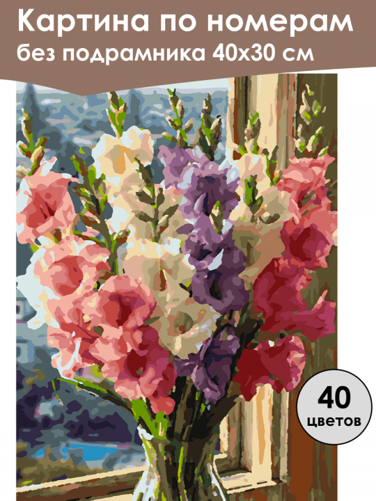 Картина по номерам без подрамника, размер 40х30 см, произведена нами. Она включает 40 оттенков и 2006 контуров, что придаёт ей глубину цвета и плавные переходы. Картина выглядит более ярко и живо. В комплект входит глянцевый лак, которым можно покрыть работу по желанию. Краски имеют хорошую укрывистость, хватает двух проходов что бы закрасить символы на схеме. Так же они сохраняют текстуру мазков, не растекаясь и не разглаживаясь полностью на холсте. При покрытии глянцевым лаком создаётся эффект приближенный к масляной живописи. Краски упакованы герметично, что сохраняет их жидкими. Все необходимые инструменты для начала работы также входят в комплект. Мы не используем экосольвентные чернила, которые содержат свинец и могут быть вредны для здоровья. Наши картины напечатаны безопасными водными пигментными чернилами, обеспечивающими чёткое изображение и легко читаемые обозначения. Холст плотный, имеет мелкую зернистость, легко разглаживается и устойчив к сминанию. Картина поставляется в бурой коробке. Следует отметить, что картина без подрамника её нельзя натянуть на подрамник из-за узких краёв, она предназначена для оформления в рамочку. Красивая ваза с цветами, в которой находятся гладиолусы различных оттенков, включая розовые, белые и фиолетовые, стоящие на подоконнике с видом на сад или двор на фоне.