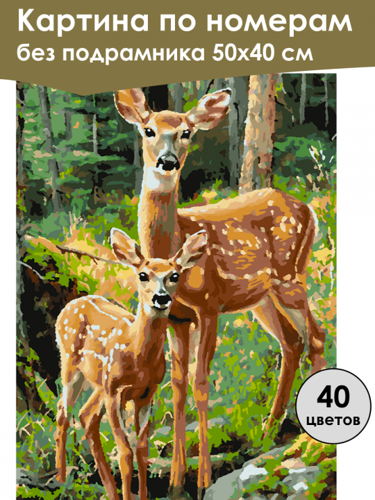 Картина по номерам без подрамника, размер 50х40 см, произведена нами. Она включает 40 оттенков и 3788 контуров, что придаёт ей глубину цвета и плавные переходы. Картина выглядит более ярко и живо. В комплект входит глянцевый лак, которым можно покрыть работу по желанию. Краски имеют хорошую укрывистость, хватает двух проходов что бы закрасить символы на схеме. Так же они сохраняют текстуру мазков, не растекаясь и не разглаживаясь полностью на холсте. При покрытии глянцевым лаком создаётся эффект приближенный к масляной живописи. Краски упакованы герметично, что сохраняет их жидкими. Все необходимые инструменты для начала работы также входят в комплект. Мы не используем экосольвентные чернила, которые содержат свинец и могут быть вредны для здоровья. Наши картины напечатаны безопасными водными пигментными чернилами, обеспечивающими чёткое изображение и легко читаемые обозначения. Холст плотный, имеет мелкую зернистость, легко разглаживается и устойчив к сминанию. Картина поставляется в бурой коробке. Следует отметить, что картина без подрамника её нельзя натянуть на подрамник из-за узких краёв, она предназначена для оформления в рамочку. Два оленя в лесу, взрослый и молодой, стоящие посреди леса, окружённые зелёной и бурой растительностью; их шерсть покрыта белыми пятнами, а в фоне видны деревья и густые заросли, создающие атмосферу дикой природы.