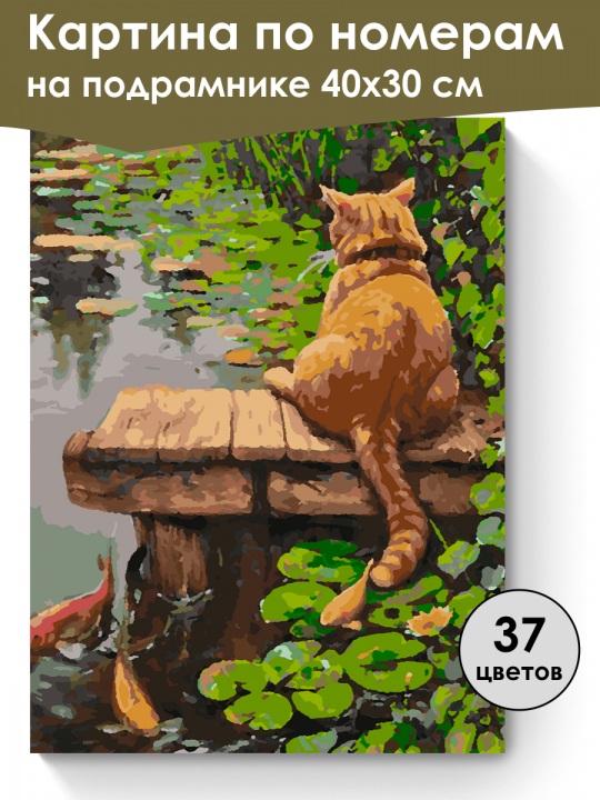 Картина по номерам на подрамнике, размер 40х30 см, произведена нами. Она включает 37 оттенков и 2455 контуров, что придаёт ей глубину цвета и плавные переходы. Картина выглядит более ярко и живо. В комплект входит глянцевый лак, которым можно покрыть работу по желанию. Краски имеют хорошую укрывистость, хватает двух проходов что бы закрасить символы на схеме. Так же они сохраняют текстуру мазков, не растекаясь и не разглаживаясь полностью на холсте. При покрытии глянцевым лаком создаётся эффект приближенный к масляной живописи. Краски упакованы герметично, что сохраняет их жидкими. Все необходимые инструменты для начала работы также включены в комплект, в том числе и крепления на стену. В картине используется крепкий подрамник со специальной вставкой, которая предотвращает провисание холста во время рисования. Это обеспечивает комфортный процесс работы и гарантирует, что холст всегда будет оставаться хорошо натянутым. Мы не используем экосольвентные чернила, которые содержат свинец и могут быть вредны для здоровья. Наши картины напечатаны безопасными водными пигментными чернилами, обеспечивающими чёткое изображение и легко читаемые обозначения. Холст плотный, имеет мелкую зернистость, легко разглаживается и устойчив к сминанию. Картина поставляется в защищённой бурой коробке. Рыжий кот сидит на деревянном настиле у края воды, наблюдая за плавающими в пруду рыбами, окружёнными зелёными кувшинками и листвой.