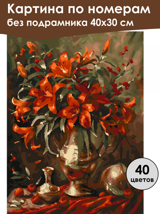 Картина по номерам без подрамника, размер 40х30 см, произведена нами. Она включает 40 оттенков и 2411 контуров, что придаёт ей глубину цвета и плавные переходы. Картина выглядит более ярко и живо. В комплект входит глянцевый лак, которым можно покрыть работу по желанию. Краски имеют хорошую укрывистость, хватает двух проходов что бы закрасить символы на схеме. Так же они сохраняют текстуру мазков, не растекаясь и не разглаживаясь полностью на холсте. При покрытии глянцевым лаком создаётся эффект приближенный к масляной живописи. Краски упакованы герметично, что сохраняет их жидкими. Все необходимые инструменты для начала работы также входят в комплект. Мы не используем экосольвентные чернила, которые содержат свинец и могут быть вредны для здоровья. Наши картины напечатаны безопасными водными пигментными чернилами, обеспечивающими чёткое изображение и легко читаемые обозначения. Холст плотный, имеет мелкую зернистость, легко разглаживается и устойчив к сминанию. Картина поставляется в бурой коробке. Следует отметить, что картина без подрамника её нельзя натянуть на подрамник из-за узких краёв, она предназначена для оформления в рамочку. Букет ярко-красных лилий в крупной вазе, окружённый красными ягодами и зелеными листьями на фоне заглушенных коричнево-зеленых тонов; внизу расположена небольшая ваза и шар, выполненные в схожей цветовой гамме, а всё вместе создает атмосферу классической натюрмортной композиции.