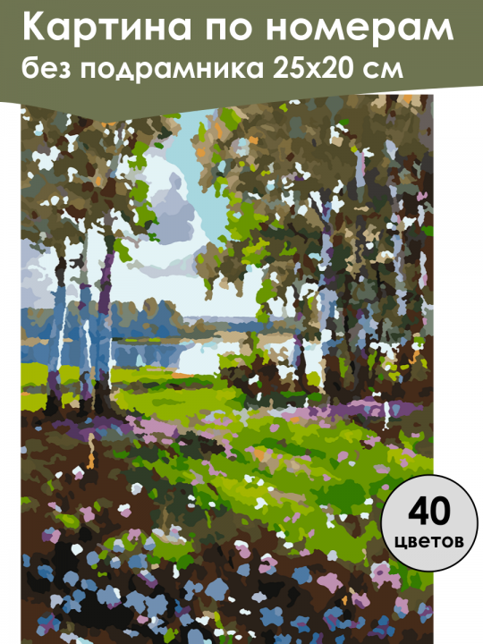 Картина по номерам без подрамника, размер 25х20 см, произведена нами. Она включает 40 оттенков и 1572 контуров, что придаёт ей глубину цвета и плавные переходы. Картина выглядит более ярко и живо. В комплект входит глянцевый лак, которым можно покрыть работу по желанию. Краски качественные, имеют хорошую укрывистость, хватает двух проходов что бы закрасить символы на схеме. Они упакованы герметично, что сохраняет их жидкими. Все необходимые инструменты для начала работы также включены в комплект. Мы не используем экосольвентные чернила, которые содержат свинец и могут быть вредны для здоровья. Наши картины напечатаны безопасными водными пигментными чернилами, обеспечивающими чёткое изображение и легко читаемые обозначения. Холст плотный, имеет мелкую зернистость, легко разглаживается и устойчив к сминанию. Картина поставляется в бурой коробке. Следует отметить, что картина без подрамника её нельзя натянуть на подрамник из-за узких краёв, она предназначена для оформления в рамочку. Живописный пейзаж с берёзами на переднем плане, под ними растут цветы, создавая яркое пятно из розовых, синих и фиолетовых оттенков, на заднем плане виднеется река, а за ней обширный горизонт, утопающий в мягких облаках и голубом небе, создавая атмосферу спокойствия и гармонии.
