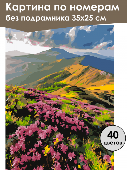 Картина по номерам без подрамника, размер 35х25 см, произведена нами. Она включает 40 оттенков и 1895 контуров, что придаёт ей глубину цвета и плавные переходы. Картина выглядит более ярко и живо. В комплект входит глянцевый лак, которым можно покрыть работу по желанию. Краски качественные, имеют хорошую укрывистость, хватает двух проходов что бы закрасить символы на схеме. Они упакованы герметично, что сохраняет их жидкими. Все необходимые инструменты для начала работы также включены в комплект. Мы не используем экосольвентные чернила, которые содержат свинец и могут быть вредны для здоровья. Наши картины напечатаны безопасными водными пигментными чернилами, обеспечивающими чёткое изображение и легко читаемые обозначения. Холст плотный, имеет мелкую зернистость, легко разглаживается и устойчив к сминанию. Картина поставляется в защищённой бурой коробке. Следует отметить, что картина без подрамника её нельзя натянуть на подрамник из-за узких краёв, она предназначена для оформления в рамочку. Живописный горный пейзаж в стиле цифровой живописи: передний план украшен яркими розовыми цветами, простирающимися вдоль склонов, а вдалеке видны волнистые ряды гор под небом с выраженными облаками, которые отражают тёплые оттенки заката или рассвета.