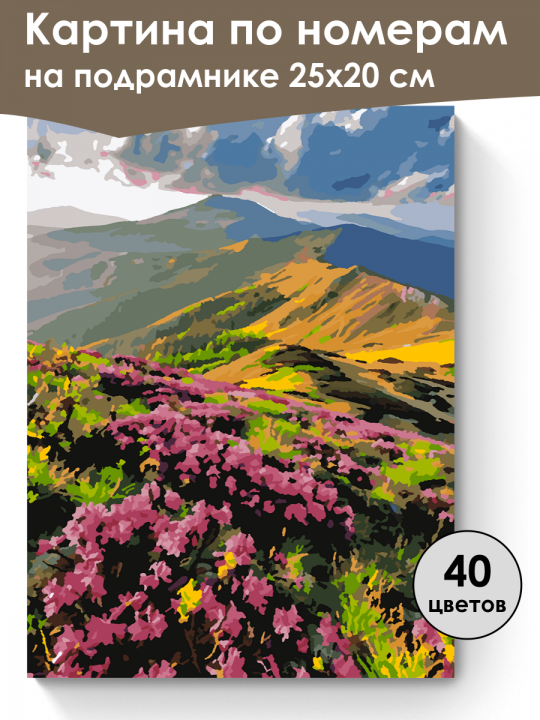 Картина по номерам на подрамнике, размер 25х20 см, произведена нами. Она включает 40 оттенков и 1130 контуров, что придаёт ей глубину цвета и плавные переходы. Картина выглядит более ярко и живо. В комплект входит глянцевый лак, которым можно покрыть работу по желанию. Краски имеют хорошую укрывистость, хватает двух проходов что бы закрасить символы на схеме. Так же они сохраняют текстуру мазков, не растекаясь и не разглаживаясь полностью на холсте. При покрытии глянцевым лаком создаётся эффект приближенный к масляной живописи. Краски упакованы герметично, что сохраняет их жидкими. Все необходимые инструменты для начала работы также включены в комплект, в том числе и крепления на стену. В картине используется крепкий подрамник со специальной вставкой, которая предотвращает провисание холста во время рисования. Это обеспечивает комфортный процесс работы и гарантирует, что холст всегда будет оставаться хорошо натянутым. Мы не используем экосольвентные чернила, которые содержат свинец и могут быть вредны для здоровья. Наши картины напечатаны безопасными водными пигментными чернилами, обеспечивающими чёткое изображение и легко читаемые обозначения. Холст плотный, имеет мелкую зернистость, легко разглаживается и устойчив к сминанию. Картина поставляется в защищённой бурой коробке. Живописный горный пейзаж в стиле цифровой живописи: передний план украшен яркими розовыми цветами, простирающимися вдоль склонов, а вдалеке видны волнистые ряды гор под небом с выраженными облаками, которые отражают тёплые оттенки заката или рассвета.