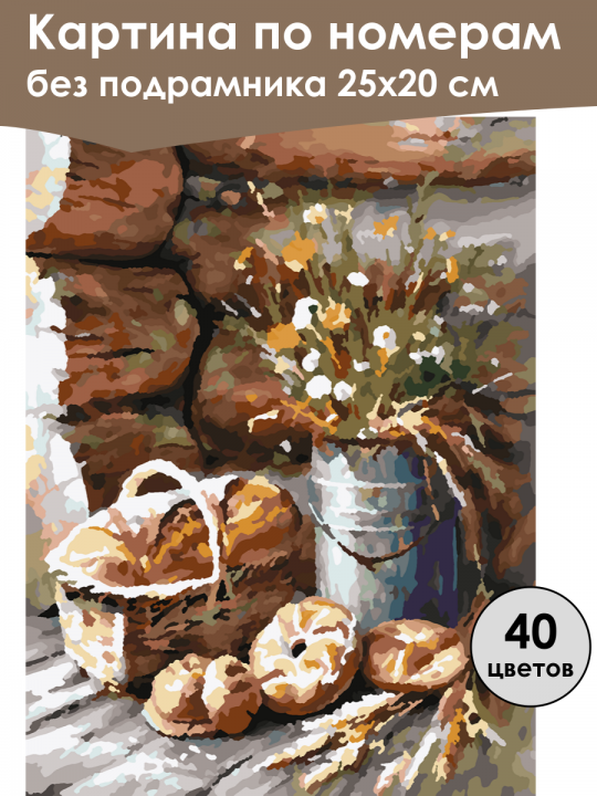 Картина по номерам без подрамника, размер 25х20 см, произведена нами. Она включает 40 оттенков и 1909 контуров, что придаёт ей глубину цвета и плавные переходы. Картина выглядит более ярко и живо. В комплект входит глянцевый лак, которым можно покрыть работу по желанию. Краски качественные, имеют хорошую укрывистость, хватает двух проходов что бы закрасить символы на схеме. Они упакованы герметично, что сохраняет их жидкими. Все необходимые инструменты для начала работы также включены в комплект. Мы не используем экосольвентные чернила, которые содержат свинец и могут быть вредны для здоровья. Наши картины напечатаны безопасными водными пигментными чернилами, обеспечивающими чёткое изображение и легко читаемые обозначения. Холст плотный, имеет мелкую зернистость, легко разглаживается и устойчив к сминанию. Картина поставляется в бурой коробке. Следует отметить, что картина без подрамника её нельзя натянуть на подрамник из-за узких краёв, она предназначена для оформления в рамочку. Деревенский натюрморт с хлебобулочными изделиями, расположенными на деревянной поверхности перед грубыми бревенчатыми стенами, рядом с плетёной корзиной с круглым хлебом и булочками, металлическим ведром, наполненным полевыми цветами, и связкой колосьев.