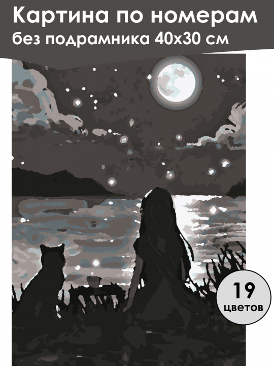 Картина по номерам без подрамника, размер 40х30 см, произведена нами. Она включает 19 оттенков и 1024 контуров, что придаёт ей глубину цвета и плавные переходы. Картина выглядит более ярко и живо. В комплект входит глянцевый лак, которым можно покрыть работу по желанию. Краски имеют хорошую укрывистость, хватает двух проходов что бы закрасить символы на схеме. Так же они сохраняют текстуру мазков, не растекаясь и не разглаживаясь полностью на холсте. При покрытии глянцевым лаком создаётся эффект приближенный к масляной живописи. Краски упакованы герметично, что сохраняет их жидкими. Все необходимые инструменты для начала работы также входят в комплект. Мы не используем экосольвентные чернила, которые содержат свинец и могут быть вредны для здоровья. Наши картины напечатаны безопасными водными пигментными чернилами, обеспечивающими чёткое изображение и легко читаемые обозначения. Холст плотный, имеет мелкую зернистость, легко разглаживается и устойчив к сминанию. Картина поставляется в бурой коробке. Следует отметить, что картина без подрамника её нельзя натянуть на подрамник из-за узких краёв, она предназначена для оформления в рамочку. Силуэты девушки и кота сидят у озера под ночным небом с яркой полной луной и мерцающими звездами, отражающимися в воде, вокруг них темные очертания растительности.