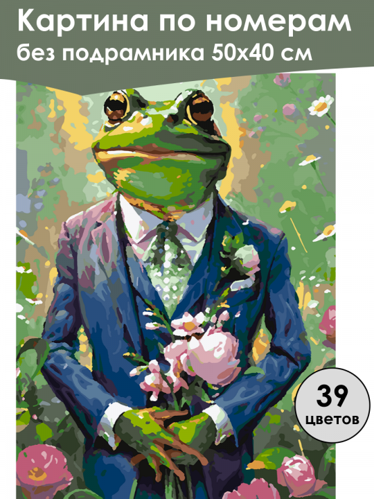 Картина по номерам без подрамника, размер 50х40 см, произведена нами. Она включает 39 оттенков и 2109 контуров, что придаёт ей глубину цвета и плавные переходы. Картина выглядит более ярко и живо. В комплект входит глянцевый лак, которым можно покрыть работу по желанию. Краски имеют хорошую укрывистость, хватает двух проходов что бы закрасить символы на схеме. Так же они сохраняют текстуру мазков, не растекаясь и не разглаживаясь полностью на холсте. При покрытии глянцевым лаком создаётся эффект приближенный к масляной живописи. Краски упакованы герметично, что сохраняет их жидкими. Все необходимые инструменты для начала работы также входят в комплект. Мы не используем экосольвентные чернила, которые содержат свинец и могут быть вредны для здоровья. Наши картины напечатаны безопасными водными пигментными чернилами, обеспечивающими чёткое изображение и легко читаемые обозначения. Холст плотный, имеет мелкую зернистость, легко разглаживается и устойчив к сминанию. Картина поставляется в бурой коробке. Следует отметить, что картина без подрамника её нельзя натянуть на подрамник из-за узких краёв, она предназначена для оформления в рамочку. Зелёная лягушка в костюме синего цвета держит букет розовых цветов на фоне зелёного сада с цветами, создавая яркую и необычную сцену.
